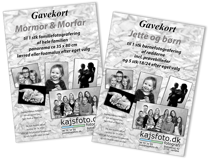 Du har mulighed for at købe et gavekort til en fotografering. Så er du løbet tør for gaveideéer til f.eks. forældre/bedsteforældre, så er et flot billede altid noget der vil vække glæde.